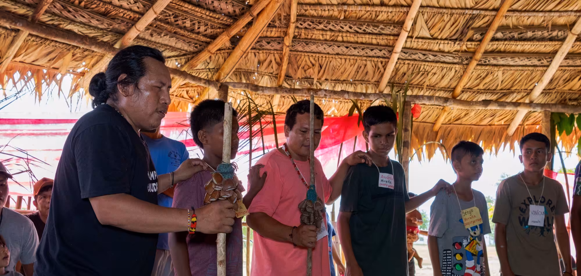 Elio Miraña ensina jovens da aldeia São Pedro do Cuiú Cuiú a realizar cantos e danças tradicionais do povo Miranha. Foto: Miguel Monteiro